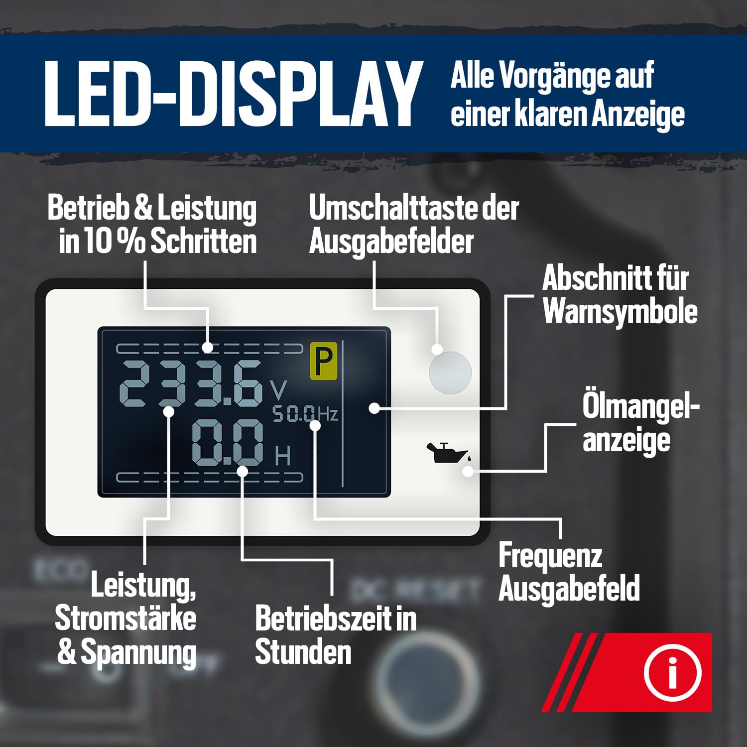 - HANDLING: Einfacher Startvorgang – einfach den Drehhebel betätigen und am Seilzug ziehen und schon kann es losgehen! Bequem zu transportieren durch leichtes Gewicht und integriertem Tragegriff. Alles im Blick durch das intelligente LED Display.